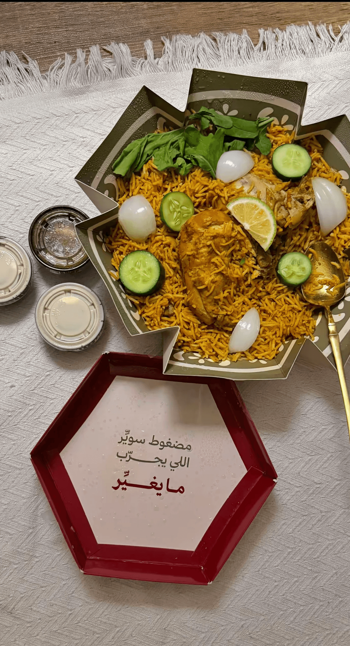 Madghoot Swayyir is a restaurant located in Riyadh, Saudi Arabia. The brand identity was built from the ground up, along with the design of its packaging. The scope of work included creating an Arabic typographic logo and applying it across packaging materials such as boxes, stickers, and bags. The color palette was selected to reflect one of the dish’s key ingredients, strengthening the connection between the visual identity and the product. A custom illustration of the traditional rice plate commonly recognized in Saudi cuisine was also created and integrated into the packaging design to echo the presentation of the dish itself.